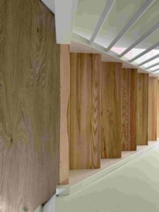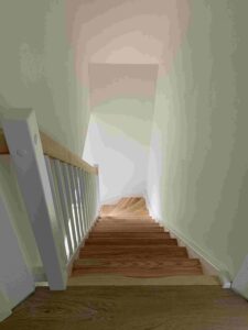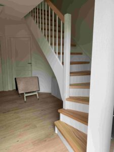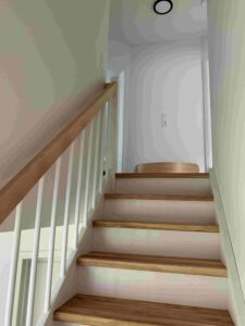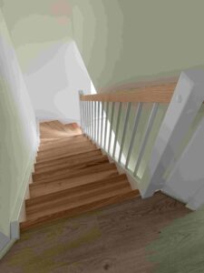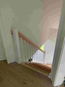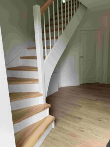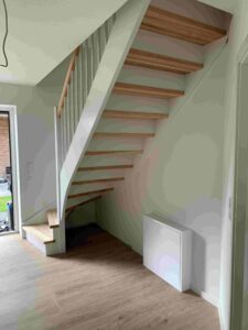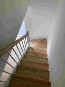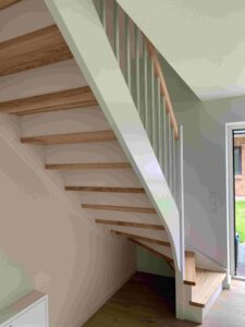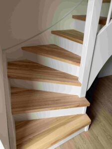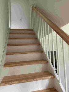 Schody jednozabiegowe, zamknięte z białymi podstopniami i wangami – schody jesionowe.