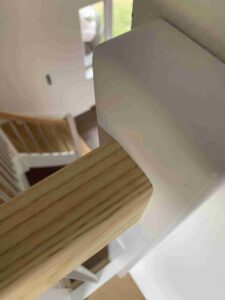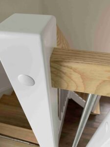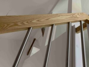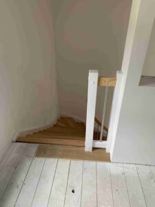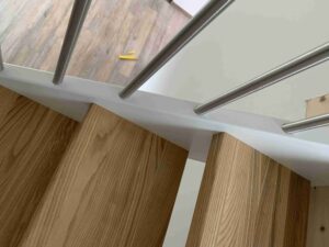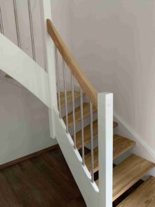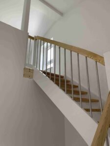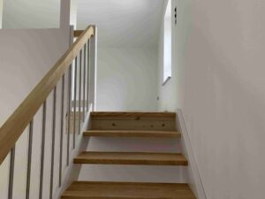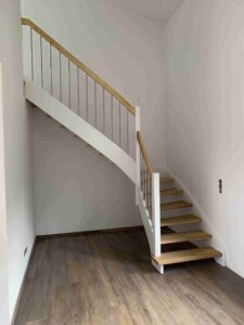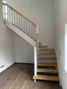 Schody jednozabiegowe, otwarte z metalowymi tralkami i białymi policzkami. Realizacja, którą wykonaliśmy dla klienta w Rankwitz (Niemcy).