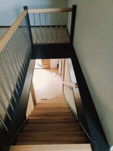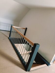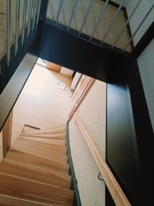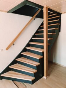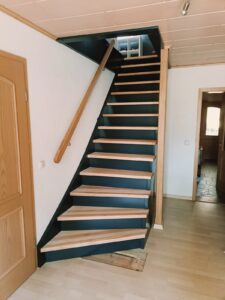 Schody proste, zamknięte, z podstopniami i wangami w eleganckim kolorze antracytu.